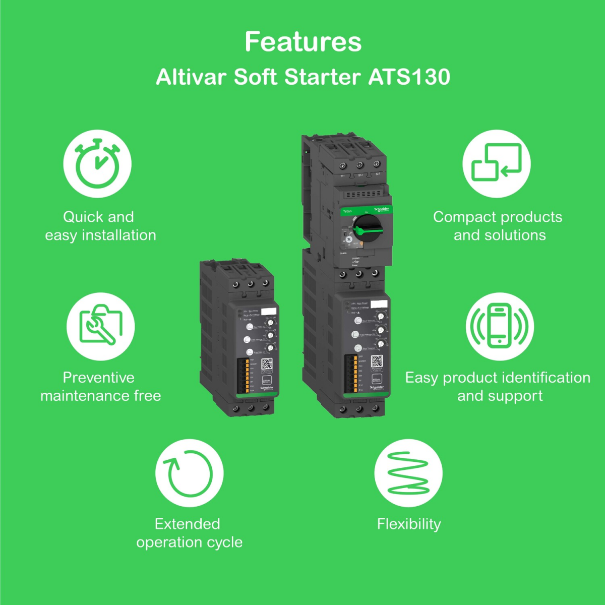•Učinkovitost delovanja med proizvodnjo V kombinaciji s toplotno magnetnimi odklopniki TeSys Deca frame 3 in 4, Altivar Serija mehkih zaganjalnikov ATS130 ponuja kompaktno in optimizirano rešitev za motor upravljanje, ki zagotavlja: